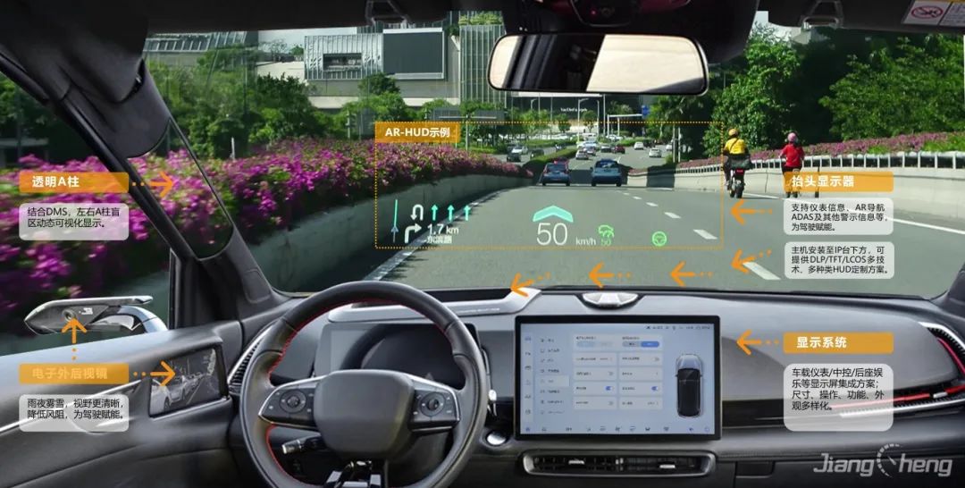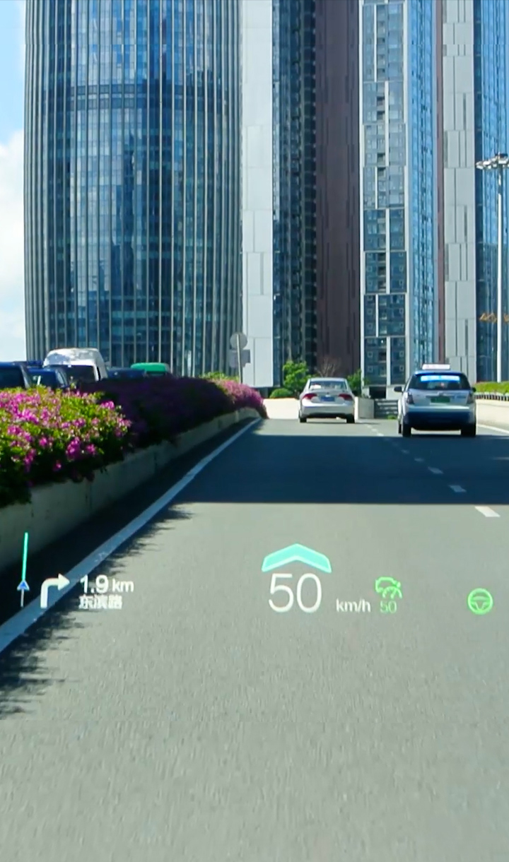 基于復(fù)雜變量環(huán)境完成大尺寸、小體積的光機設(shè)計,并采用多數(shù)據(jù)融合算法實現(xiàn)導(dǎo)航、ADAS等輔助駕駛信息在真實路況上的疊加、融合顯示,提升駕駛安全性的同時給予更酷炫、更智能的駕駛體驗。
